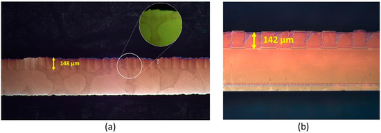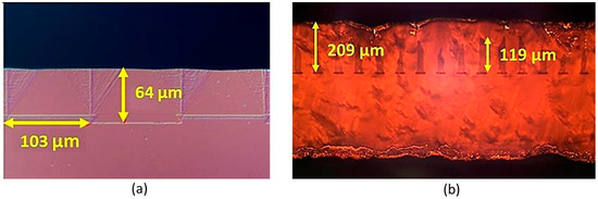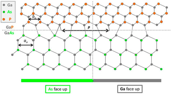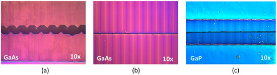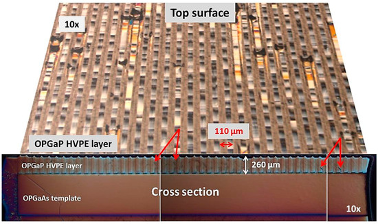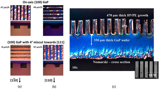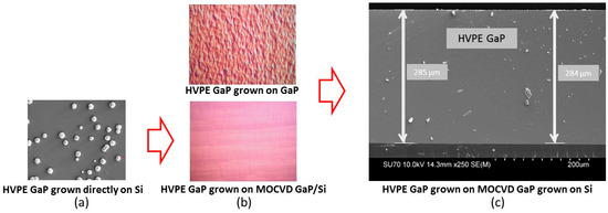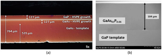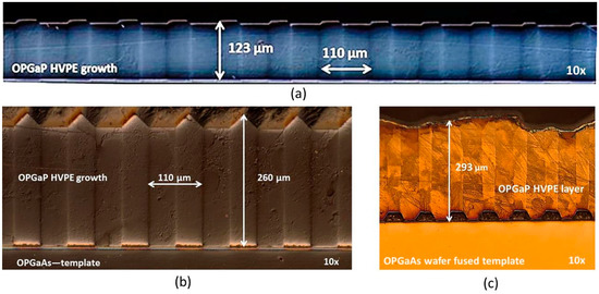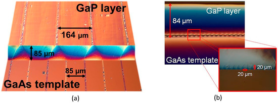 Another reason for excluding wafer bonding is the poor parallelism of the GaP wafers—bonding such wafers leaves voids between them (Figure 12a), something that usually does not happen when bonding two GaAs wafers (Figure 12b). To avoid this, the GaP wafer parallelism should be improved before bonding by the so-called “fly-cut” technique [62]. This additional procedure, however, not only makes this template preparation more expensive and complex, but also leaves several micron deep parallel grooves on the wafers’ surface that must be also polished off prior to bonding. There is another reason to give up the wafer bonding technique—the fact that to date a so-called “etch-stop” material for the case of GaP has not yet been discovered, while at least two “etch-stoppers”, AlGaAs and InGaAs, can be used in the GaAs wafer bonding process. The major role of the etch-stop is to secure the thickness of the so-called inverted layer. No etch-stop layer means uncertainty in the inverted layer thickness and in that whether the subsequent HVPE growth has in any way access to both crystallographic orientations, or only to one of them. More details can be found in [63].