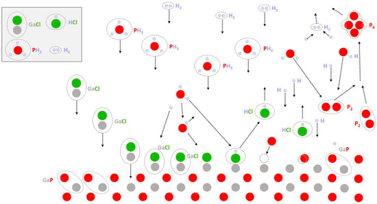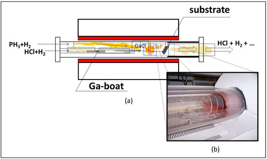 The traditional Hydride Vapor Phase Epitaxial (HVPE) process (called “Hyrdide” in the case of GaAs or GaP growth but “Halide” when we grow III-Nitrides) can be performed in a horizontal hot wall quartz reactor (Figure 17a). Although that it is a relatively old growth technique, the HVPE, in contrast to its modern alternatives well-known in the semiconductor industry, the Metal Organic Chemical Vapor Deposition (MOCVD) and the Molecular Beam Epitaxy (MBE) is the only method for a relatively fast (hundreds of µm/h), and thick (up to millimeters) growth of binary semiconductor materials such as GaN, GaP, GaAs, etc., as well as their ternaries and quaternaries. In the particular case of HVPE growth of GaP a quartz boat with molten gallium is placed near the inlet of a horizontal quartz tube (reactor tube), which is placed within a 3- or 4-zone resistive furnace. Precisely, the Ga-boat, is inside of a smaller quartz tube, called a nozzle, which is positioned in the middle along the axis of the reactor tube. A mixture of HCl and H2 overflows from the Ga boat as HCl picks up some of the molten Ga, forming with different probabilities GaCl, GaCl2 or GaCl3, releasing at the same time an additional amount of H2. The role of the H2 flow through the nozzle is not only to carry but also to dilute the flow of HCl to a desired extent. Once formed, gallium chloride is further delivered out of the nozzle. Another flow of phosphine PH3 (also carried and diluted by a separate H2 flow) is introduced separately at the periphery of the reactor tube. The PH3 flow meets for the first time the gallium chloride flow at the end of the nozzle tube. The two gases make a mixture with the intention to form GaP, hopefully, in surface reactions that take place on the growing substrate or template surface placed in the way of the mixture (Figure 17a). However, earlier formation of GaP, for example, on the edge of the nozzle or on the inner reactor wall is also possible—we will call these reactions “parasitic” (Figure 17b).