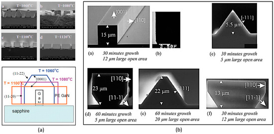 - Davis, R.F.; Gehrke, T.; Linthicum, K.J.; Zheleva, T.S.; Preble, E.A.; Rajagopal, P.; Zorman, C.A.; Mehregany, M. Pendeo-epitaxial growth of thin films of gallium nitride and related materials and their characterization. J. Cryst. Growth 2001, 225, 134–140. [Google Scholar] [CrossRef]