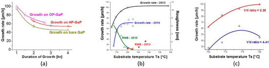While the higher price of the substrates, as a major product component of the final product, will be a real problem later, the low surface quality is a serious obstacle right away. With such surface morphology one should expect nothing less than more intensive 3D growth in comparison to the case of GaAs homoepitaxy. This is because the etch pits, being associated with ends of screw dislocations, provide plenty of sites for the atoms approaching the growing surface to adhere and thus promote spiral growth and formation of 3D islands that due to the Ehrlich–Schwoebel effect will convert in later growth stages into larger 3D formations—hillocks. This means that growth that starts on a substrate surface with higher EPD will result in a rougher surface morphology (Figure 11). This effect is less pronounced if the bare (plain) substrates are with some miscut. Then the atomic terraces, formed during the miscut, provide also plenty of atomic sites for the approaching atoms and thus compete with the etch pits. However, lower quality growth on a bare substrate also means a poorer surface morphology when the growth is performed on OP templates fabricated from such substrates. Moreover, because of this reason we should exclude one of the two known template preparation techniques [60,61], the wafer bonding techniques, where only “on-axis” wafers can be used for bonding, so a miscut is not going to help.