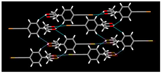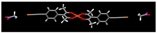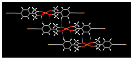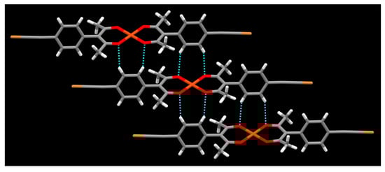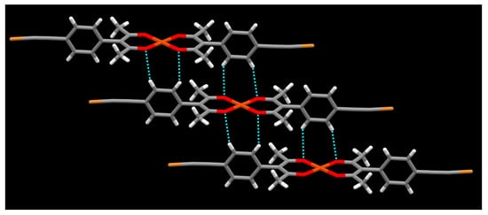 Even though halogen bonded iodo-nitromethane synthons are reported [44,45], in the metal ligand complex [Cu(L2)2]·2CH3NO2, nitromethane, which lacks halogen-bond acceptor sites that are effective with the relatively weak bromine atom, simply acts as non-directional space filling in the crystal structure (Figure 10). There are no prominent short contacts involving the bromoethynyl group. In the crystal packing, C-H⋯O hydrogen bonding between hydrogens of phenyl group and oxygen of acac moiety is observed (Figure 11) similar to the packing of [Cu(L2)2]·2C4H8O2. Both hydrogens of the phenyl group show interactions with acac oxygen atoms r(O⋯H) 2.50 Å and 2.57 Å.