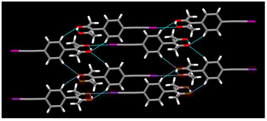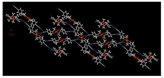 In the presence of weakly coordinating solvents such as nitromethane, halogen-solvent interactions are not observed. Activated iodine has shown the ability of forming interactions with the π-electron density of a triple bond which can act as a halogen bond acceptor [46,47,48]. In the complex [Cu(L3)2], mainly halogen⋯π interactions and halogen⋯oxygen interactions are observed due to the absence of a competitive halogen bond acceptor solvent. The structure propagates in a 3-D direction with halogen bonding and halogen⋯π interactions between halogen atom and triple bond-π cloud (Figure 17). In this 3D assembly, halogen⋯π interactions between the halogen atom and the π-electron cloud of the phenyl group also assist to hold the packing.