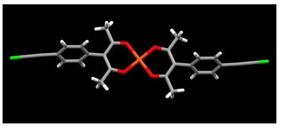 The geometry of the complex ion in the crystal structure of [Cu(L1)2] (color codes: red—oxygen; green—chlorine; orange—copper).