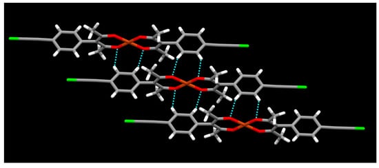 Without any axially coordinated ligands, adjacent complex ions are again close enough to form stacks as a result of intermolecular C-H⋯O hydrogen bonding between phenyl rings and acac moieties (Figure 14) ca. r(O⋯H) 2.63 Å and 2.76 Å.