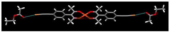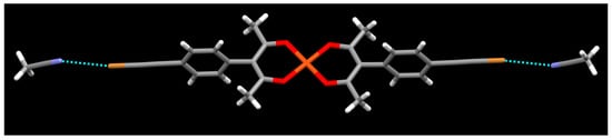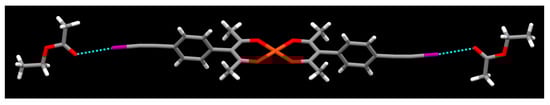 When the solvent is changed from acetonitrile to ethyl acetate the metal ion remains four-coordinate as there is no axial coordination of solvent molecules (Figure 13). There are, however, halogen bonds between the iodoethynyl group and the O=C group of ethyl acetate, r(I⋯O) 2.91 Å (a 20.0% vdW reduction), θ (C-I⋯O) 172.33°, θ (I⋯O=C) 128.19°.
