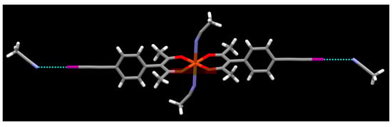 The reaction between copper(II) tetrafluoroborate hydrate and L3 in acetonitrile produced a 1:2 metal-ligand complex with four solvent molecules included in the structure. Even though the metal center contains two acac ligands in a square planer arrangement, the overall geometry is octahedral as two acetonitrile molecules are axially coordinated to the Cu(II) ion. The activated iodine atom forms a halogen bond with the acetonitrile solvent molecule (Figure 12); r(I⋯N) 2.98 Å (a 15.6% vdW reduction), θ (C-I⋯N) 174.28°, θ (I⋯N≡C) 141.61°. This time there are no prominent C-H⋯O intermolecular interactions.