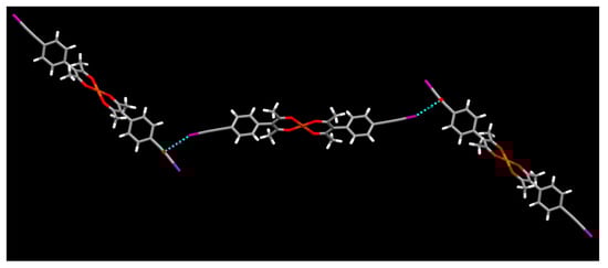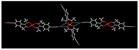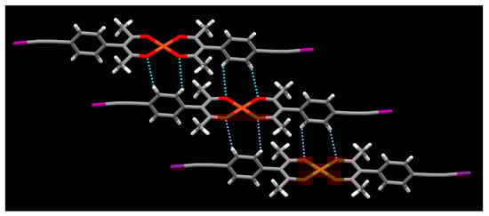 Halogen⋯π interactions in the structure of [Cu(L3)2] (color codes: red—oxygen; purple—iodine; orange—copper).