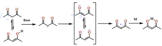 Chelation of metal ions by β-diketones (acac) ligand.