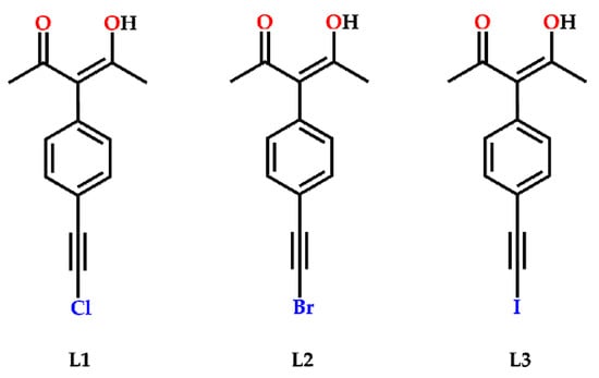 An earlier study on the possible use of halogen bonds in this synthetic context involved the combination of Cu(II) ions and acac-based ligands substituted with a halogen atom [37]. However, structure-directing halogen-bonds were not observed largely due to the fact that the halogen atoms had not been ‘activated’ with the aid of adjacent electron-withdrawing groups [38,39,40,41] or through an sp-hybridized carbon atom [42,43]. In order to modify this early strategy, we synthesized three new ligands (L1–L3) where the halogen atom was replaced with a haloethynyl species (Scheme SI). They all contain the necessary acac-moiety but by increasing the electrophilic σ-hole on the halogen-bond donor they may offer more pronounced structure-directing vectors, Scheme 2.