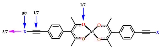 In each free ligand, one can envision that there are four competing halogen-bond acceptor sites; a lone pair on the keto oxygen atom, the hydroxylic oxygen atom, the π-electron cloud on the ethynyl group and the electronegative equatorial region on each halogen atom, Scheme 3a. In the corresponding metal complexes we reduce the number of unique competing halogen-bond acceptors to three; an oxygen atom from the deprotonated acac-moiety, as well as the triple bond, and the equatorial region on the halogen atom, Scheme 3b. The purpose of this synthetic/structural study is to establish which of these different acceptor sites is going to dominate the eventual solid-state structures.