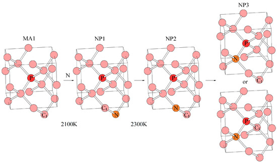 23], it was shown that the main reason for nitrogen diffusion towards the nickel-related defects was the Coulomb interaction. The substitutional nitrogen defect donates an electron to the nickel defect. Also, there is thermal activation of nitrogen diffusion upon annealing. Based on the obtained experimental data, the formation mechanism of nitrogen–nickel defects was proposed. The evolution of the nitrogen–nickel defects consists of several stages: