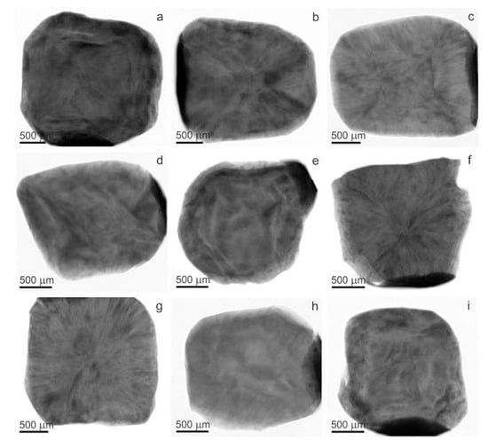 Anomalous birefringence patterns of double-polished plates of yellow cuboid diamonds from the Northeastern Siberian platform (photos taken between crossed polarizers) (a—MP-30; b—MP-43; c—MP-56; d—MP-60; e—MP-71; f—MP-83; g—MP-87; h—MP-98; i—MP-108).