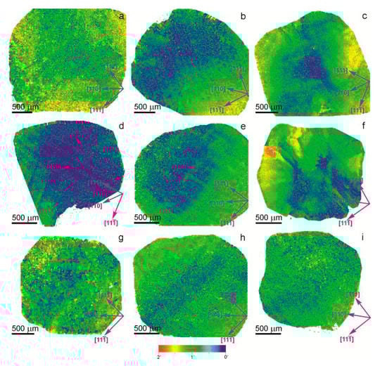Misorientation patterns of yellow cuboid diamonds from the Northeastern Siberian platform. EBSD maps over a large parts of the polished plates showing a change in orientation up to 2° from blue to red (a—MP-30; b—MP-43; c—MP-56; d—MP-60; e—MP-71; f—MP-83; g—MP-87; h—MP-98; i—MP-108).