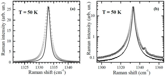 Raman line of the nitrogen-containing diamond (circles) and of the defect-free diamond (line) at T = 50 K: (a) linear scale for the intensity; (b) logarithmic scale for the intensity.