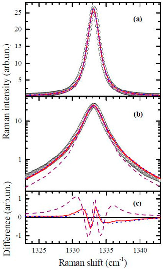 As we have demonstrated previously, the Raman line of diamond crystals with a negligible amount of defects can be well described by the Voigt contour, where the Gaussian component reflects the spectral resolution of the experimental setup (0.3 cm−1 in our experiments) and the Lorentzian component reflects the broadening caused by anharmonicity [21]. The results of the Voigt contour fitting applied to the Raman spectrum of the nitrogen-containing diamond are shown in Figure 2. It is found that fits with both the fixed Gaussian component (width set to 0.3 cm−1) and with the free parameter describe the experimental line contour with good quality. However, if we suppose that the defect-induced broadening has a Gaussian-like contribution and fix the Lorentzian width, setting it to a value found for the defect-free diamond, then the quality of the fit notably decreases. Therefore, we may conclude that the substitutional nitrogen defects causes the Lorentzian-like broadening of the Raman line of diamond.