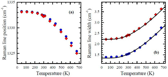 Temperature dependences of the Raman line parameters of the nitrogen-containing diamond (diamonds) and defect-free diamond (circles): (a) line position; (b) Lorentzian line width. The lines depict fits by Equation (1) (see text for details).
