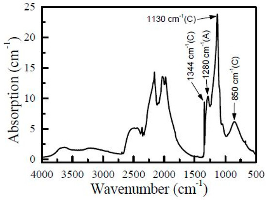 A representative infrared absorption spectrum of the diamond sample used in the study. The main absorption features related to the C- and A-centers are indicated.