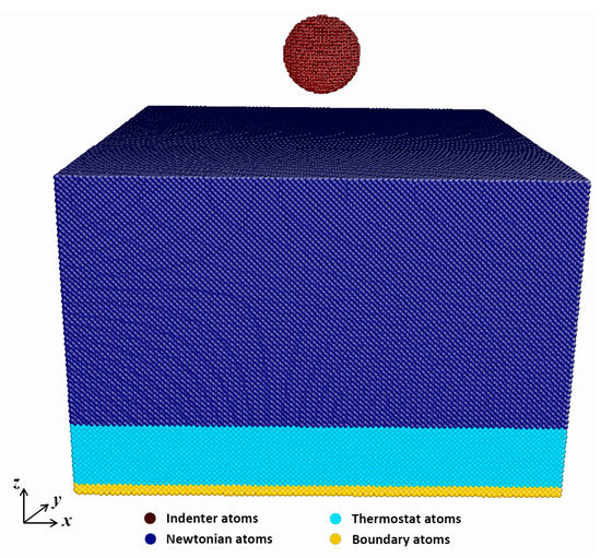 - Yaghoobi, M.; Voyiadjis, G.Z. Effect of boundary conditions on the MD simulation of nanoindentation. Comp. Mater. Sci. 2014, 95, 626–636. [Google Scholar] [CrossRef]