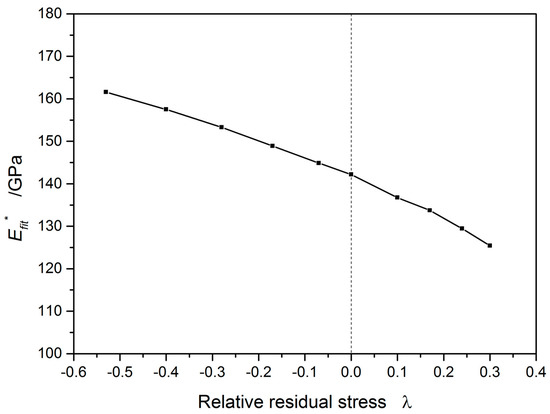 where the indentation modulus E* is the material’s elastic response, and can be obtained from curve fitting in an MD simulation as shown in Figure 4. The indentation modulus E* has, however, 142.6 GPa as calculated by the load vs. indentation depth curve, which is a bit larger than the 136.7 GPa reported in the literature [31]. The modulus E*fit shows a linear decrease with the reduction of compressive stress (and the increase of tensile stress). This indicates that the residual stresses have an important effect on the elastic property of single copper thin film, which is consistent with empirical estimates by experiments and finite element simulations [32].