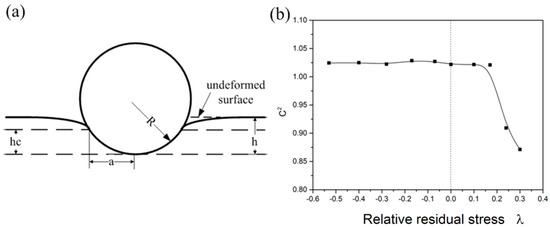 (a) A spherical indentation geometry, where a is contact radius, hc is contact depth, h is indentation depth, and (b) relative contact area curve versus residual stress.