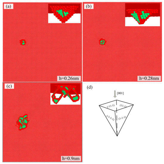 Atom configuration during indentation process without residual stress: (a–d) schematic of four inclined {111}-type slip planes for (100) indentation. The green color shows stacking faults.