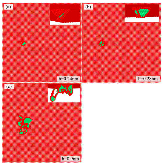 Atom configuration during indentation process with residual tensile stress λ = 0.17 at various indentation depths: (a) 0.24 nm; (b) 0.28 nm; (c) 0.9 nm. The green color shows stacking faults.