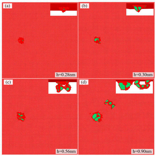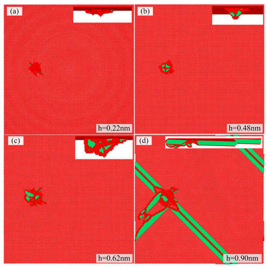 Atom configuration during indentation process with residual tensile stress λ = 0.30 at various indentation depths: (a) 0.22 nm; (b) 0.30 nm; (c) 0.42 nm; (d) 0.90 nm. The green color shows stacking faults.