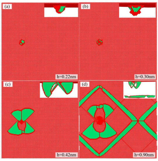 It can be observed from Figure 8, Figure 9, Figure 10, Figure 11 and Figure 12 that small atom clusters appear in the indented film with penetrating initiating, which can be regarded as precursors to dislocations. As the indentation depth moves beyond a critical indentation depth, dislocation embryos occur as shown in Figure 8, Figure 9, Figure 10, Figure 11 and Figure 12, then, they evolve and transform to a tetrahedral structure, which corresponds to a sharp load drop as shown in Figure 2 and Figure 3. In all cases, the Shockley partial dislocations bounding the stacking fault domains are nucleated and evolved in {111} planes (as shown in Figure 8d), which commonly occurs for FCC (111) nanoindentation. Similar results are also observed in the MD simulation of Cu in the (111) surface [24], although there exist three atom clusters in indented film. From b to c in Figure 8, Figure 9, Figure 10, Figure 11 and Figure 12, a great quantity of dislocations initiate and propagate, and dislocation loops also appear beneath the indented film with the increasing indentation depth in the strain burst regime (Figure 2 and Figure 3). However, compared with the dislocation distribution in compressive residual stress (in Figures 10d and 12d), the dislocations are extended to a deeper position beneath the indented surface in tensile residual stress, as shown in Figures 9c and 11d. In addition, it can be easily understood that a larger tensile residual stress accompanies a much smaller indentation depth for the incipient plasticity, which is contrary to the case of compressive residual stress, verifying the variation in the load drop regime in the load vs. indentation depth curves (Figure 2 and Figure 3).