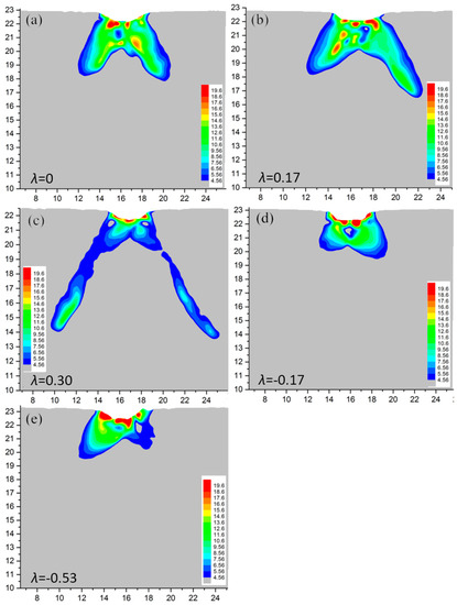 Indentation plastic zone with different residual stresses: (a) λ = 0; (b) λ = 0.17; (c) λ = 0.30; (d) λ = −0.17; (e) λ = −0.53.