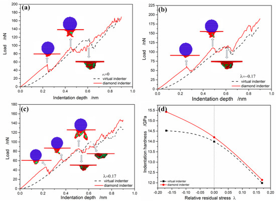 In theory, it is believed that the simulation results obtained by a realistic indenter should be more practical than the ones by a virtual indenter. Here, it is helpful to conduct a comparison of the simulation results obtained by a realistic indenter and a virtual indenter, under the same indentation condition. The load versus indentation depth curves are presented in Figure 15. It can be seen from Figure 15a–c that the two load-depth curves are quite similar in general, but for the realistic indenter the incipient plasticity loads are higher than the ones for the virtual indenter, and a similar result can be found in the regime after plastic yielding. Similarly, it can be observed in Figure 15d that the hardness by the realistic indenter is higher than the one by the virtual indenter. These results are ascribed to the smoothness degree of the indenters. At the same time, the dislocation length vs. the relative residual stress under the same indentation depth (0.9 nm) is plotted in Figure 16. It can be found that the dislocation length by the realistic indenter is longer than the one by the virtual indenter for any residual stress level. Both Figure 15 and Figure 16 provide a detailed description of the difference between the two indenter models.
