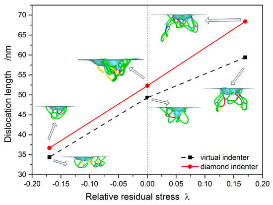 To further reveal the effect of residual stress on the dislocation distribution, a dislocation line length is introduced to describe the dislocation density in a certain volume. Dislocation lines are detected using the dislocation extraction algorithm (DXA) algorithm [37], and plotted as a function of relative residual stress in Figure 13. It can be seen that the dislocation line length increases linearly from λ = −0.28 to λ = 0.17, while it increases rapidly with the increasing tensile residual stress when the relative residual stress exceeds 0.17. This indicates that the larger tensile residual stress leads to a dramatic increase in dislocation density, and consequently deteriorates the indented surface film. When the compressive residual stress is smaller than −0.28, the dislocation density increases again as shown in Figure 13. By carefully examining the atomic configuration images, the increasing zone of dislocation density is mainly located at the subsurface, compared with Figure 12d, which definitely results in the dislocation vanishing in the surface during indenting. It also becomes a reason why a decrease of hardness occurs for a much larger compressive stress as shown in Figure 6.
