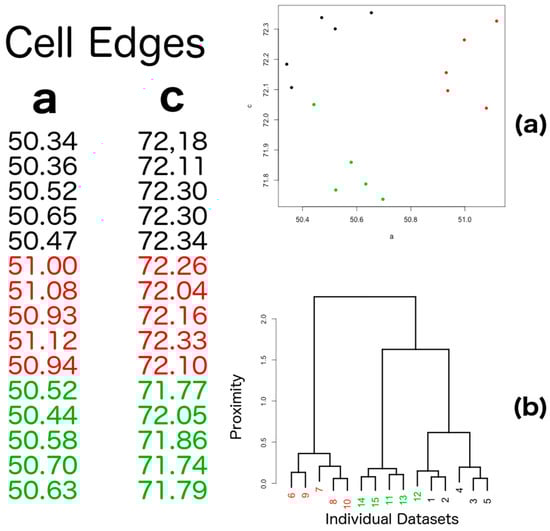 Hierarchical clustering, based on cell parameters for a simulated group of 15 crystals in a tetragonal space group. (a) Only lengths a and c of the unit cell are variable quantities useful to describe crystals variation in the tetragonal system (see data in panel on the left). The 15 crystals are separated in three groups (black, red and green) with similar structural features (crystal isomorphism). Cell parameters alone can be insufficient to discriminate among isomorphous groups. In this specific example, crystal 12 is closer to the black group than to the green group because the size of its unit cell is closer to the unit cell size of crystals 1 and 2; (b) Dendrogram reflecting hierarchical cluster analysis for the 15 crystals just described. The three isomorphous groups are well separated with the exception of crystal 12, forming a cluster with the black, rather than the green group.