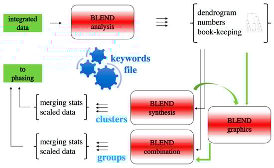 The creation of a dendrogram is, most of the time, meant to highlight homogeneous groups. In the specific process we are describing, the aim could be to single out one or more groups of isomorphous crystals. In BLEND, though, a different philosophy has been adopted since the very first version of the program. It is suggested that each cluster (each branching node in the tree) potentially leads to a useful solution. Subsequent processing of specific clusters, automatically carried out within BLEND using the programs POINTLESS and AIMLESS [36,37], reveals the sufficiency or inadequacy of the resulting dataset to be used for further processing leading to structure solution. There are many tools in BLEND to facilitate the analysis and further processing of each cluster. For this reason, the program can be considered semi-automated software, as it allows combined datasets to be assembled without human intervention, but requires synergy with the user for the definition of datasets with improved quality. There are many ways to create a DMC from different datasets after the initial clustering. Each way depends on the specific requirements of the final DMC. For example, if high resolution is required with the hope of observing side chains or even atom-atom bonds in the electron density map, then most of the constituent datasets with high resolution will need to be included, even if their merging statistics are not among the best available. Or, if a nearly-complete combined dataset still has not reached a desired target completeness, datasets with lower isomorphism can be included in the nearly-complete group, with the assumption that influence on the most important structural features in the electron density map will be negligible. Statistical quality indicators are produced by the software for each cluster or modified cluster. This makes it possible to carry out dataset creation and management according to users’ preferences, guided by the quality indicators. The overall structure of the BLEND program with its various components is shown in Figure 2. There are, essentially, three different main running modes: (1) an analysis mode in which datasets are checked, information from each one of them extracted, and the dendrogram produced; (2) a synthesis mode in which datasets out of each cluster are combined and scaled; and (3) a combination mode, in which datasets not grouped in any existing cluster are combined and scaled. Other modes of execution also exist to allow additional types of operations, not possible within the remit of the three main modes. It is envisaged that more modes will be added in the future, and that eventually the program will be equipped with a graphical interface with which execution and interplay of the various modes will become more intuitive for users. Useful tutorials illustrating how to use BLEND with specific examples are available at the main CCP4 website [38]. A complete description of the many uses of BLEND, with special reference to membrane proteins is also available in “The Next Generation in Membrane Protein Structure Determination” [39].