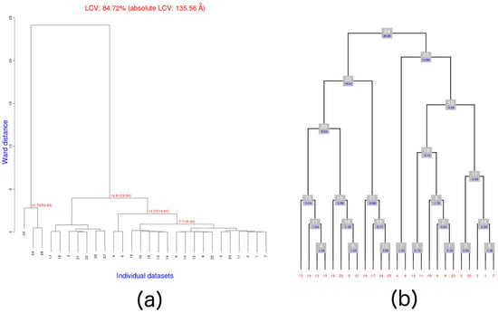 In this group, there are 28 datasets in space group P2221, collected from 10 crystals formed with a solution containing gadolinium, subsequently soaked in a solution containing osmium, and finally dehydrated with the addition of salts corresponding to protocol dh1. The best strategy with BLEND at the very beginning of a data combination process is to execute the program in dendrogram-only mode (option –aDO) in order to check the validity of all files involved, and to display the dendrogram. The program does not produce all files needed for subsequent runs, but it runs faster in this mode, and rapidly identifies outliers among the datasets. The result of the analysis of all 28 datasets in group 25 is shown in Figure 4a, and it is clear that datasets 23, 24 and 28 are very non-isomorphous with the other datasets and also among themselves.