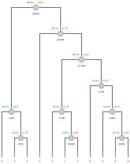 Annotated dendrogram for the 11 datasets used from the serial group 2. Each numbered node corresponds to a cluster Around each node there are three values annotated with overall completeness (green), resolution as computed using CC1/2 (red) and overall Rmeas (blue).
