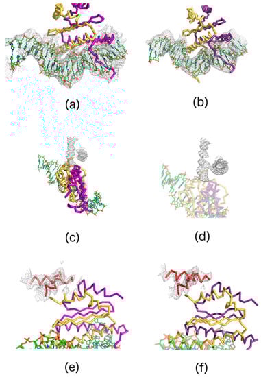 The observed values reflect that the model is still very incomplete, the resolution limited and because the DNA confers some flexibility to the overall structure. Nonetheless, two goals have already been achieved with the two datasets used: (1) much of DNA structure could be built and fitted in clear density; and (2) additional protein-like density that could not be ascribed to SRF is visible, indicating the possible location of MRTF-A for the first time. Model and electron density details are shown in Figure 7.