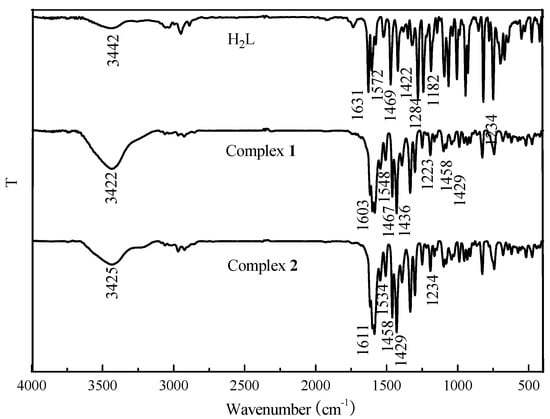 The IR spectra of H2L and its corresponding complexes 1 and 2 exhibit various bands in the 400–4000 cm−1 region (Figure 1). The most important IR bands are listed in Table 2. In general, the O-H stretching frequency of most compounds is usually expected in the 3300–3800 cm−1 region, but this frequency of the free ligand H2L is displaced to 3437 cm−1 because of the intramolecular hydrogen bond O-H···N=C interaction. The free ligand exhibits characteristic C=N stretching bands at 1631 cm−1, while those of complexes 1 and 2 were observed at 1603 and 1611 cm−1, respectively. The C=N stretching frequencies are all shifted to lower frequencies by 28 cm−1 and 20 cm−1 upon complexation, indicating a decrease in the C=N bond order due to the coordinated bond of the Co(II) atom with the imino nitrogen lone pair [50]. The Ar–O stretching frequency appears as a strong band at 1284 cm−1 for H2L and at 1234 cm−1 for complex 2. Meanwhile, a bending vibration of phenolic alcohol in H2L at 1182 cm−1, which disappears in the complexes, indicated the phenol hydroxy groups of H2L were protonated and the oxygen atom coordinated to the Co(II) ions [13,15]. The Ar-O stretching frequency was shifted to a lower frequency, indicating that a Co-O bond had been formed between the Co(II) ion and phenolic oxygen atom of the ligand.