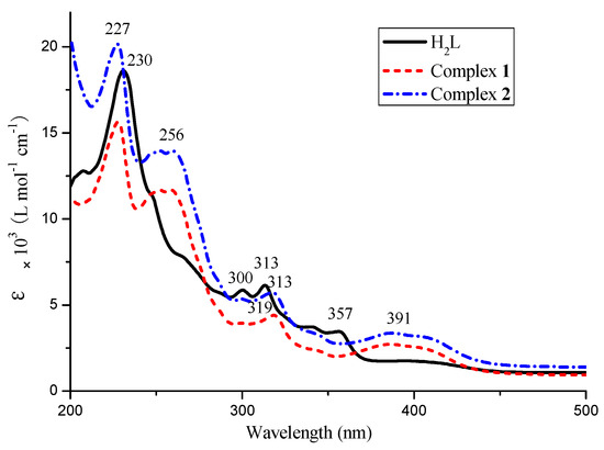 The UV-Vis absorption spectra of H2L and its corresponding complexes 1 and 2 in 5.0 × 10−5 mol·L−1 DMF solution are shown in Figure 2. The electronic absorption spectrum of the free ligand H2L consists of two relatively intense bands at 230 nm, 316 nm and one weak band at 357 nm, the first absorptions observed at 230 nm and 316 nm can be signed to the π-π* transition of the benzene rings, while the absorption peak at 357 nm was attributed to the intra-ligand π-π* transition of the oxime group [52]. The complexes 1 and 2 show almost identical UV–Vis absorption spectra. The absorption bands around 313 nm are only marginally red-shifted (4–6 nm) in the spectra of the complexes. Upon coordination of the ligands, the absorption bands at about 357 nm disappeared and the new bands at 256 nm appeared in the UV-Vis spectra of the complexes 1 and 2, which indicates that the oxime nitrogen atoms are involved in coordination to Co(II) atoms [53]. In addition, the other new absorption peak is observed at ca. 391 nm in Co(II) complexes, which is attributed to the M→L charge-transfer transition. This is characteristic of the transition metal complexes with Salen-type ligands [54,55].
