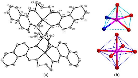 (a) View of the coordination environment of Co(II) center with thermal ellipsoids at 30% probability in 1 with a labelling scheme (all H atoms have been omitted for clarity); (b) The coordination polyhedron of Co(II) in 1.