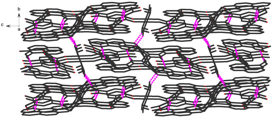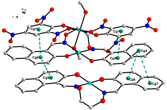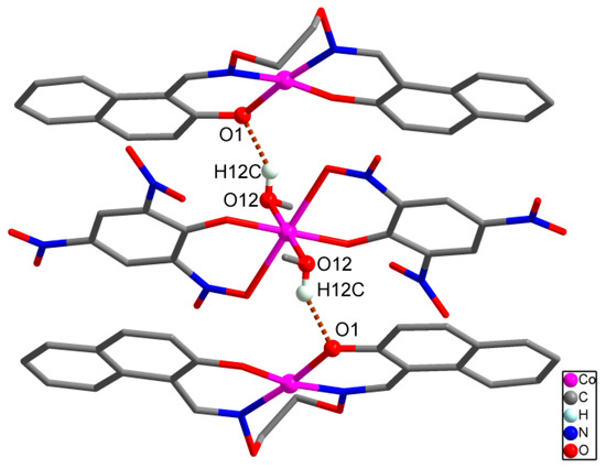 It should be noted that important intermolecular hydrogen bonding interactions exist between the molecules in complex 1 as listed in Table 4. Firstly, intermolecular hydrogen bonds between the coordinated methanol molecules of [Co(Pic)2(CH3OH)2] unit and oxygen atoms of the μ-naphthoxo group in the ligand anion L2− of [CoL] unit, O12-H12C···O1, are formed between the [CoL] and [Co(Pic)2(CH3OH)2] units which link the neighboring one [Co(Pic)2(CH3OH)2] unit and two [CoL] units into a tri-polymer as shown in Figure 5. In addition, every tri-polymer further links eight other adjacent tri-polymer units into an infinite 3D–network supramolecular structure by four pairs of intermolecular C11-H11···O7 and C21-H21···O10 hydrogen bonds (Figure 6) between the two -CH groups of the ligand anion L2− in [CoL] units and the oxygen atoms of the picric acid anion Pic− in [Co(Pic)2(CH3OH)2] units, respectively. Furthermore, this linkage is further stabilized by the π···π stacking between the benzene ring (Table 5 and Figure 7) of the adjacent [CoL] and [Co(Pic)2(CH3OH)2] units. Consequently, with the help of O-H···O and C-H···O hydrogen bonds, π···π stacking interactions, the crystal structure of 1 shows an assembly 3D supramolecular network structure (Figure 8) introduced by a coordinated picrate.