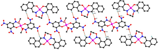 According to the above, this complex is very interesting from the structural point of view. First, complex 1 with the picrate anion contains in the crystal structurethe tetracoordinate molecule [Co(L)] with a distorted square planar coordination geometry. This geometry is rather rare for the Co(II) complexes, especially when the abundance of this topology is compared with the tetrahedral and distorted tetrahedral geometries. Second, in the CSD only five other examples of Co(II) complexes with coordinated picrate anions can be found. Two of them, the nitro oxygen atoms of the picrate anion were not involved in coordination with Co(II) ions and in the other three Co(II) complexes [56,57,58], the coordination mode of picric anions is consistent with the coordination pattern reported in this paper. The Co-O(NO2) bond lengths in complex 1 is 2.335 Ǻ, which is within the range of previously published Co(II) complexes involving coordinated picrate anion with that of 2.459 Å, 2.190 Å, 2.110 Å, and 2.149 Å [57,58,59], respectively.