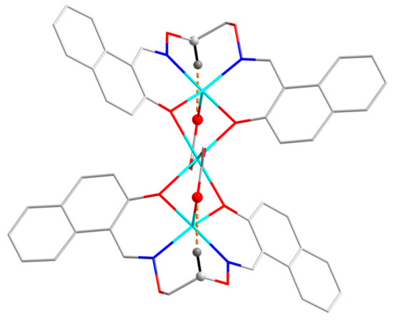 The compound 1,2-bis(aminooxy)ethane was synthesized by a similar method to that reported previously [46,47] and 2,2’-[ethylenedioxybis(nitrilo-methylidyne)]dinaphthol (H2L) was synthesized according to an analogous method reported previously in the literature [48,49]. A methanolic solution (20 mL) of 1,2-bis(aminooxy)ethane (92.1 mg, 1.0 mmol) was added to a solution of 2-hydroxynaphthaldehyde (349.5 mg, 2.02 mmol) in ethanol (20 mL) and the mixture was stirred at 55 °C for 4 h. Then the solvent was removed under reduced pressure and the residue was recrystallized from ethanol to give the ligand H2L (897.5 mg, 56.5%). M.p. 157–158 °C. Anal. Calcd for C24H20N2O4 (%): C, 71.99; H, 5.03; N, 7.00. Found: C, 71.81; H, 5.02; N, 6.85. 1H NMR (400 MHz, CDCl3, ppm) δ = 4.59 (s, 4H, CH2-O, CH2-O), 7.19 (d, J = 8.8 Hz, 2H, Ar-H), 7.25 (s, 2H, Ar-H), 7.35 (t, J = 3.6 Hz, 2H, Ar-H), 7.50 (t, J = 4.2 Hz, 2H, Ar-H), 7.78 (d, J = 8.8 Hz, 2H, Ar-H), 7.94 (d, J = 8.4 Hz 2H, Ar-H), 9.22 (s, 2H, N=CH), 10.93 (s, 2H, ArO-H).
