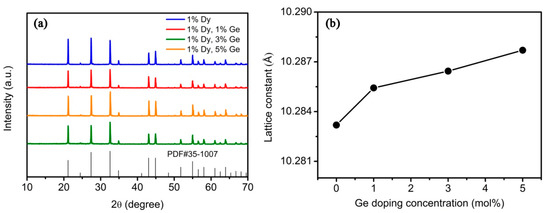 (a) Powder X-ray diffraction patterns of Dy,Ge:BSO crystals; (b) Lattice constants of Dy,Ge:BSO single crystals plotted against Ge content.