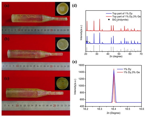 The as-grown Dy,Ge:BSO crystals and their top parts are shown in Figure 2, (a) 1 mol% Dy3+ doped, (b) 3 mol% Ge4+ doped, and (c) 3 mol% Ge4+ and 1 mol% Dy3+ co-doped. All of the crystals are 1 inch in diameter and 80–100 mm in length, while they are transparent and free of cracks and inclusions. However, the top parts of them differ substantially. As can be seen from Figure 2a,b, there is a white residual segregation layer at the top parts when mono-doping Dy3+ or Ge4+ ions into BSO crystals. When 1 mol% Dy3+ and 3 mol% Ge4+ are co-doped in BSO crystals, the top part is without any white residue, as shown in Figure 2c. The XRD patterns of the top parts for 1%Dy:BSO and 1%Dy,3%Ge:BSO crystal are compared in Figure 2d. The top part of 1%Dy,3%Ge:BSO crystal is pure BSO phase, while the segregated phase of the white residue for 1%Dy:BSO is polycrystalline SiO2 (tridymite). It should be mentioned that 1%Dy,5%Ge:BSO crystal is also free of the white residue. Obviously, the white residual disappears until more than 3 mol% Ge4+ is co-doped. As the X-ray rocking curves of 1%Dy:BSO and 3% Ge:BSO crystal are nearly the same, we just present the results of 1%Dy:BSO and 1%Dy,3%Ge:BSO crystals for comparison, as shown in Figure 2e. The full width at half maximum (FWHM) of these two samples are measured to be about 57″ and 24″ respectively, which implies that 1%Dy,3%Ge:BSO crystal possesses higher crystallization quality. Thus, co-doping Dy3+ and Ge4+ ions with proper concentrations can substantially modify the crystallization behavior and improve the quality of BSO crystal.
