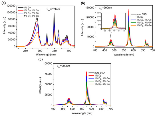 Taking valence states, crystallochemical behavior, and ionic radii of Bi3+ (103 pm), Si4+ (26 pm), and Dy3+ (91 pm) into consideration, Dy3+ ions replaced Bi3+ ions site easily in BSO crystal. So the site occupied by Dy3+ was the same as that of Bi3+ with C1 site symmetry based on crystallographic structure of BSO. Figure 3a shows the photoluminescence excitation spectrum of Dy,Ge:BSO crystals recorded by monitoring the emission at 574 nm corresponding to the 4F9/2→6H13/2 transition. It can clearly be seen that a broad band in the range from 220 nm to 310 nm corresponds to the oxygen to bismuth charge transfer band. Besides, the spectrum also displays five other bands centered at 324, 349, 363, and 391 nm in the UV region, which are attributed to the 4f–4f transitions of Dy3+ and from 6H15/2 ground state to 6P3/2, 6P7/2, 6P5/3, and 4I13/2 excited states, respectively. The fluorescence emission spectra of Dy,Ge:BSO single crystals and powered Dy,Ge:BSO single crystals excited by 290 nm are shown in Figure 3b,c. The spectra mainly consist of three emission peaks located at 486, 574, and 662 nm, which correspond to the transitions of 4F9/2-6H15/2, 4F9/2-6H13/2, and 4F9/2-6H11/2, respectively. Besides, pure BSO only has a broad emission band located at about 480 nm. The intrinsic emission peaks of BSO peaked at 480 nm and the characteristic emission peaks of Dy3+ ions peaked at 486, 574, and 662 nm are weakened with the improvement of Ge4+ doping level.