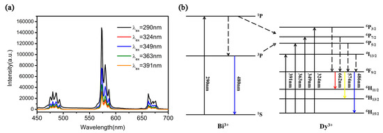Even though the emission intensity of 1%Dy,3%Ge:BSO crystal is weaker than 1%Dy:BSO crystal, it is still the optimal choice due to the high crystallization quality and moderate emission intensity. The emission spectra of 1%Dy,3%Ge:BSO crystal excited by 290, 324, 349, 363, and 391 nm is also measured and presented in Figure 4a. Obviously, though the excitation intensity of 290 nm is not the strongest, the emission intensity of the crystal excited under 290 nm is much stronger than excited under other lights. It is indicated that the energy absorbed by Bi atoms is transferred to Dy3+. The emission mechanism of Dy,Ge:BSO crystals is depicted in the partial energy level diagram, as shown in Figure 4b.