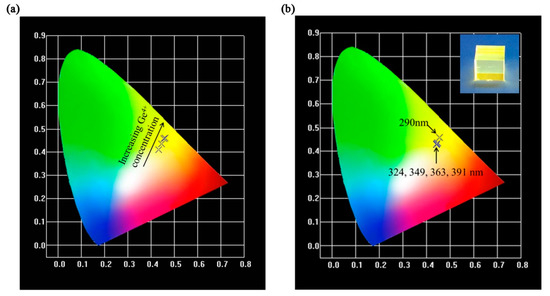 In order to further investigate the emission color of Dy,Ge:BSO crystals, the Commission International de L’Eclairage (CIE) chromaticity coordinates under different UV excitations were calculated using the corresponding emission spectrum in Figure 3b and Figure 4a, and are listed in Table 1. As shown in Figure 5a, under the excitation light of 290 nm, the coordinates of Dy,Ge:BSO crystals shift along the direction of warmer white light region when the concentration of Ge4+ is increased. That means co-doped Ge4+ in Dy:BSO crystals is helpful to emitting warmer white light. From Figure 5b, we can also see when 1%Dy,3%Ge:BSO crystal is excited by 290, 324, 349, 363, and 391 nm, the coordinate is (0.456, 0.457), (0.446, 0.432), (0.447, 0.435), (0.443, 0.428), and (0.443, 0.429), respectively. If the wavelength of excited light is longer than 290 nm, all of the coordinates turn to almost the same (0.45, 0.43) and are in the region of warm white light. Although the coordinates deviate slightly from others under the excitation wavelength of 290 nm, it is still in the region of warm white light. The inset is the polished 1%Dy,3%Ge:BSO crystal, emitting brightly warm white light under 365 nm UV light illumination, which is the common wavelength of commercial UV LED chip and just close to the excitation peak centered at 363 nm in our samples. It should be mentioned that the intensity of this excitation peak is lower than that of the peaks located at 290 nm and 349 nm. This means our samples can be more efficiently excited if a 290 nm or 349 nm UV-LED chip could be developed. So the results mean that no significant change is observed and stable warm white light can be emitted with variation of the excitation wavelength from 290 nm to 390 nm.