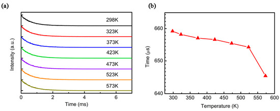 Thermal stability of fluorescence materials for WLEDs is one of the most important technological parameters, high-power WLEDs should operate above 423 K [37]. Thus, it is important to evaluate the thermal stability of fluorescent materials for practical application. The temperature dependence of the decay curves of 1%Dy,3%Ge:BSO crystal have been measured. The curves corresponding to 4F9/2-6H13/2 transition around 574 nm upon 290 nm excitation are presented in Figure 6a. Each decay curve can be described to good approximation to a single exponential function in the temperature range of 298–573 K, which indicates that Dy3+ occupies only one site. The lifetime value can be fitted as