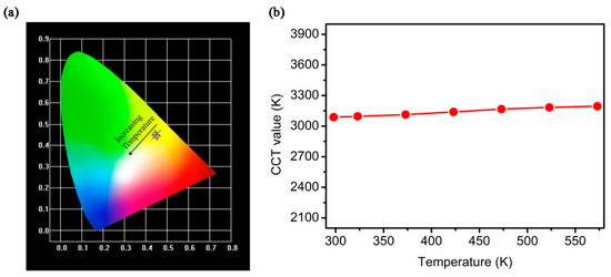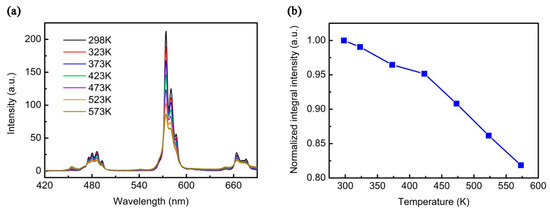 The temperature dependent emission spectra of 1%Dy,3%Ge:BSO crystal, measured at various temperatures ranging from 298 K to 573 K and recorded at the excitation of 290 nm, is presented in Figure 7a. It is clearly observed that the shapes of the emission peaks are similar and no emission bands shift at different temperatures. However, the intensity of the emission peaks decrease with the incensement of temperature, which can be described by thermal quenching. The thermal quenching temperature (T1/2) is defined as the temperature at which the emission intensity is 50% of its original intensity. Thus, the value of the thermal quenching temperature can be deduced from the intensity of emission peaks at different temperature. The thermal quenching temperature T1/2 is found to be as high as 523 K. Furthermore, the normalized integrated photoluminescence intensity as a function of temperature is illustrated in Figure 7b, the photoluminescence intensity increases gradually as the temperature declines. The photoluminescence intensity of the crystal only decreases 4.8% of the initial value when the temperature increases from room temperature to 423 K, exhibiting much smaller thermal quenching than YAG:Ce3+ (~80%) [38], Y2O3:Eu3+ (~74%) [39]. Moreover, more than 80% PL intensity at room temperature is still retained even at the high temperature of 573 K. Besides, as shown in Figure 8a, the coordinates of 1%Dy,3%Ge:BSO crystal are near the coordinates of (0.46, 0.46) with the improvement of temperature. The CCT value of it is improved just from 3088 K to 3190 K when the temperature increases from 298 K to 573 K, as shown in Figure 8b. The above results definitely indicate that 1%Dy,3%Ge:BSO crystal has excellent thermal stability.