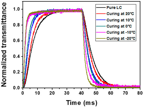 In the meantime, it was reported that the average domain size of a polymer structure decreases as the curing temperature decreases [17,18,19]. In addition, the LC viscosity increases exponentially as the curing temperature decreases, which slows the polymer diffusion. The reduced polymer diffusion rate will decrease the average domain size. Therefore, low-temperature UV curing can reduce the average domain size at a fixed polymer material concentration.